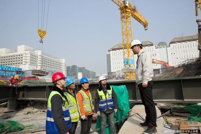 2月27日,中建二局北京分公司第八項目部項目經(jīng)理、黨支部書記石榮在西單文化廣場升級改造項目現(xiàn)場辦公。圖為石榮和同事交流(圖片來源:tuku.qianlong.com)。千龍網(wǎng)記者 于穎攝