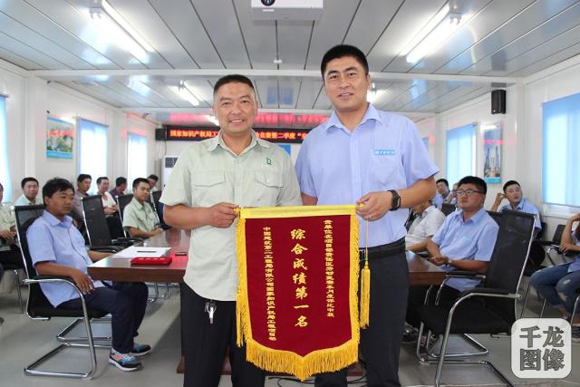 2018年8月,石榮為參加中建二局北京分公司國家知識產(chǎn)權(quán)局項目建設(shè)的勞動競賽優(yōu)秀單位頒發(fā)錦旗。中建二局北京分公司供圖 千龍網(wǎng)發(fā)